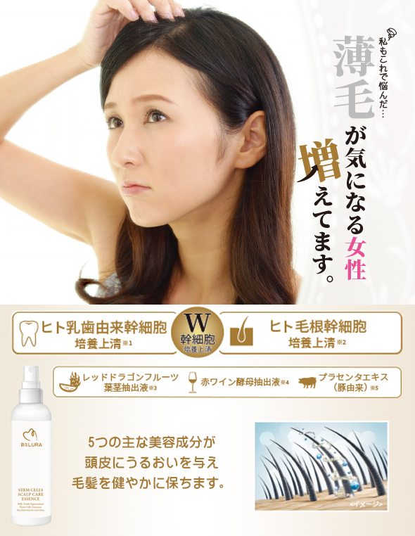 乳歯歯髄幹細胞培養上清メインに、ヒト毛根幹細胞培養上清をブレンドした「W培養上清」として新配合されています。 頭皮にうるおいを与え、毛髪を健やかに保つスカルプケアエッセンスです。