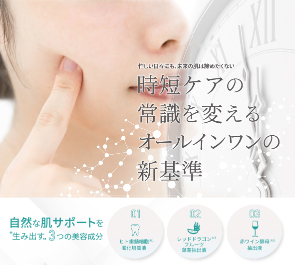 主要成分 「乳歯由来歯髄幹細胞培養上清」 「植物エクソソーム水」 「赤ワイン酵母抽出液」 「カミツレ花エキス」 「フユボダイジュ花エキス」